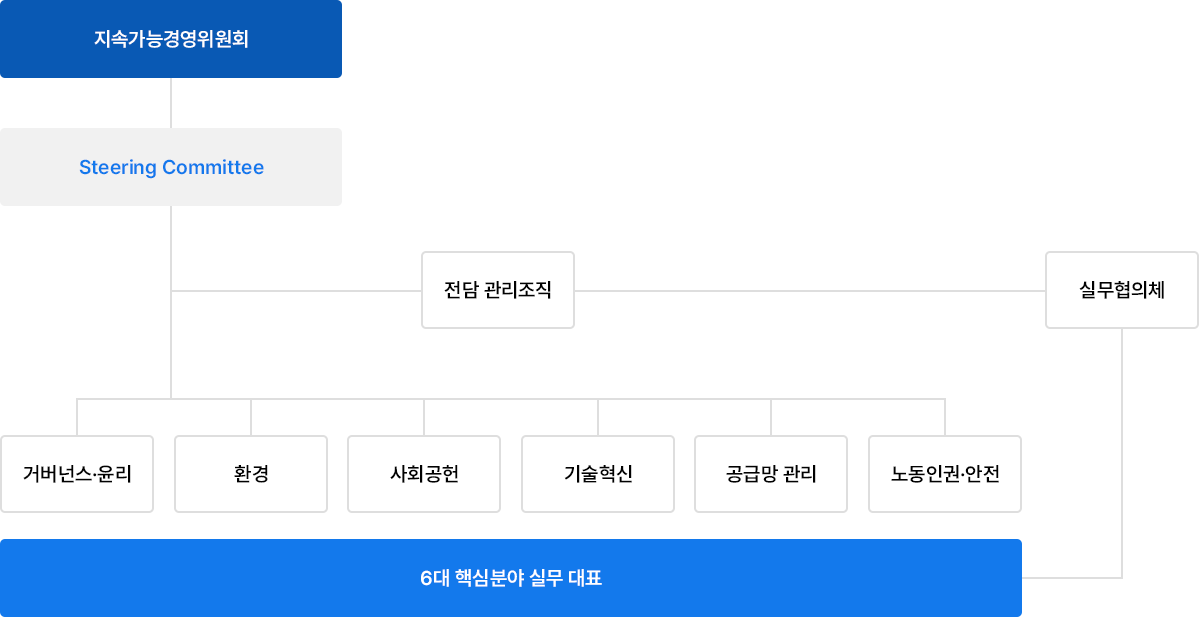 지속가능경영 추진단(Steering Committee) 보고를 통해 지속가능경영 관련 정책 수립, 과제 수행 현황 및 활동 성과 공유, 개선방안 논의를 진행합니다.